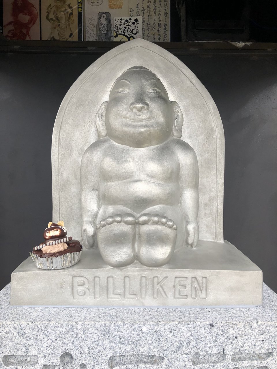 ビリケンさんの台座部分。半分崩壊したBILLIKENの文字が見えます。アニメでは省略されていましたが、原作でゆかりさんがビリケンさんの足の裏を掻くシーンにはちゃんと書いてありましたね。
