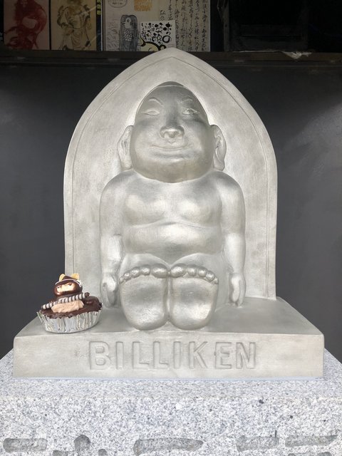 たぬケーキをお供え。実際、ビリケンさんを見かけるたびに何かしらお供えされてたりします。上記の写真でも小銭やらジュースやらお供えされているのがわかると思います。